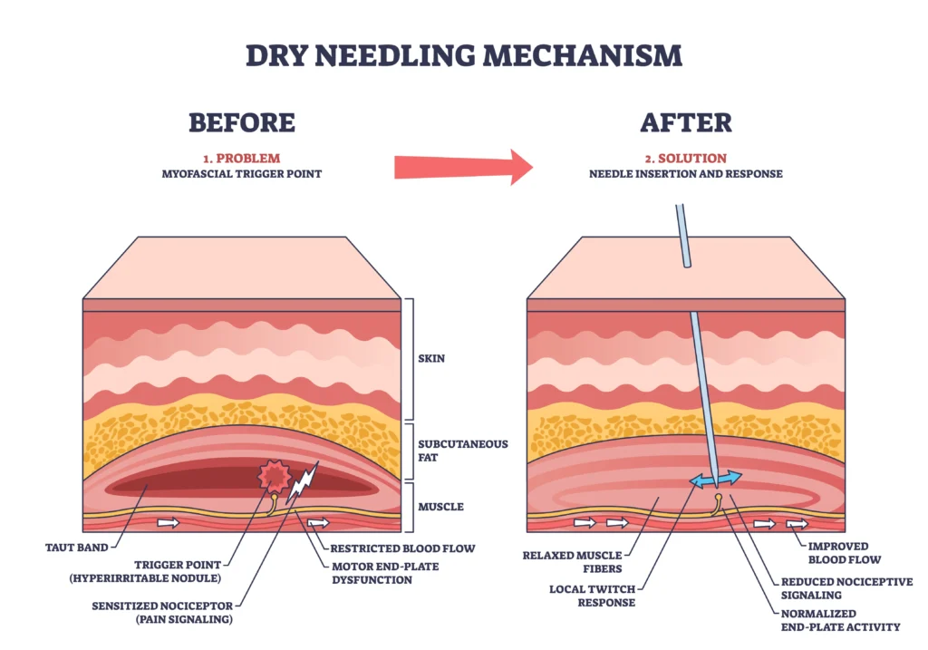 The underlying mechanism of dry needling involves releasing trigger points, which have several effects on the body: