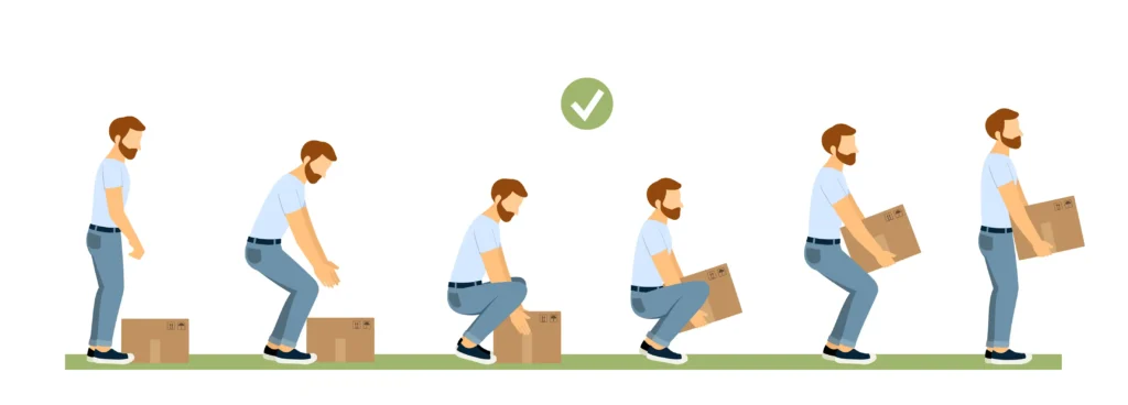 - Avoid bending your torso to pick up items (even if they aren’t heavy). Instead, use positioning devices (like a forklift) to bring the items right in front of you.